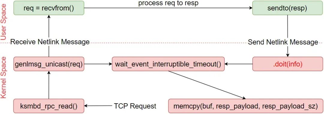 漏洞案例2数据流图 案例3:攻击Generic Netlink消息解析过程 漏洞CVE-2024-26811 (Linux Kernel ksmbd smb2_read_pipe OOB Read)的场景与案例2相似。但其漏洞是发生在Generic Netlink的doit函数,该函数没有检查属性负载内容的合法性,最终导致了越解读。该漏洞需要结合TCP去触发。