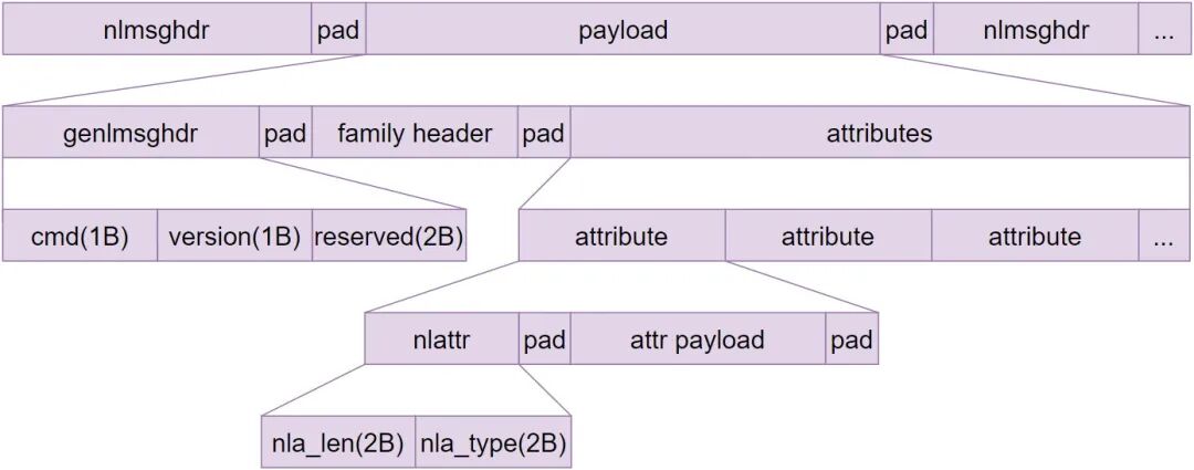 Classic Netlink Bottom-Up传输消息组建 Generic Netlink内核机制 Generic Netlink是基于Classic Netlink创建,从其大体的消息结构可以看出。不同点在于负载的组成,包含了一个Generic Netlink消息头、family头、属性和它们的填充。每个属性又包含了1个属性头、属性负载和它们的填充。