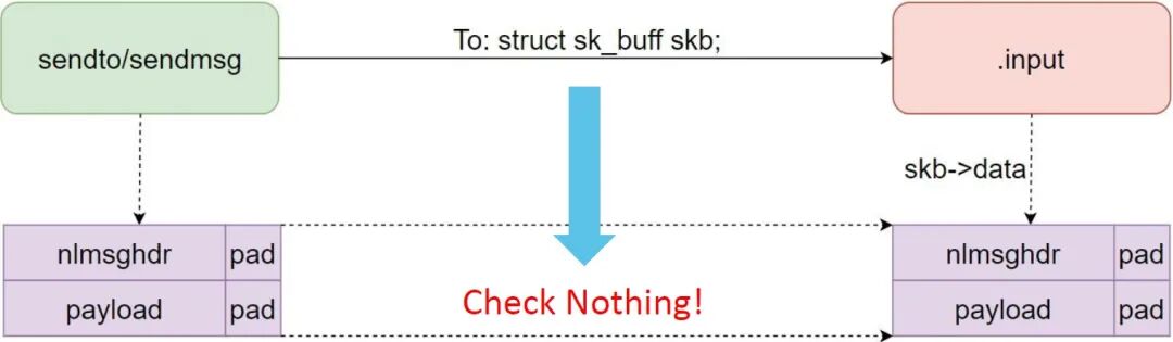 Classic Netlink传输消息格式 Classic Netlink传输消息通过sendto或者sendmsg函数从用户空间发送到内核空间。skb包含了该传输消息,它是input函数的唯一参数,可以在input函数中通过skb->data获取该传输消息。问题是Linux内核Netlink子系统会如何检查该传输消息?答案是什么都不检查。这意味着开发者需要自己检查该传输消息头,而将检查交给开发者本身就是一个危险的行为。