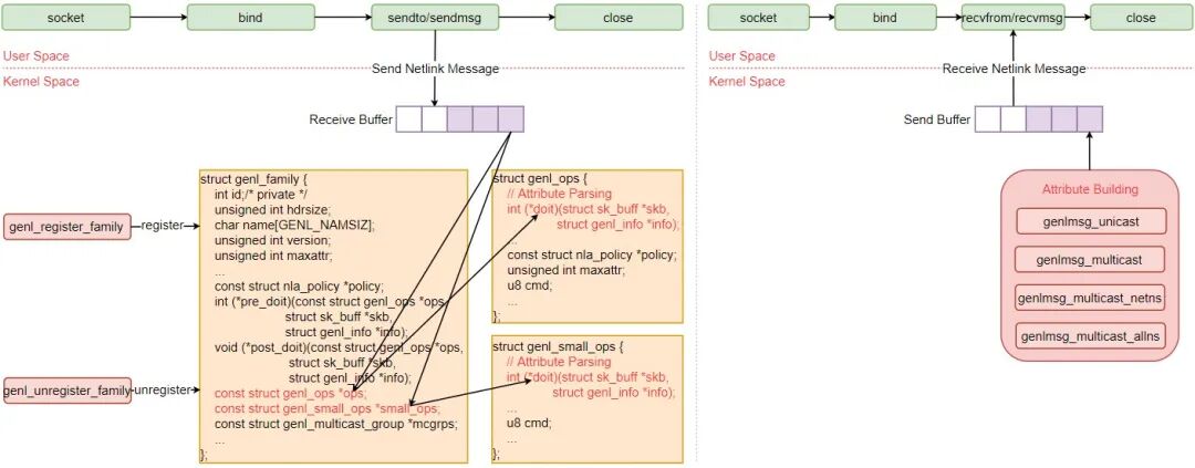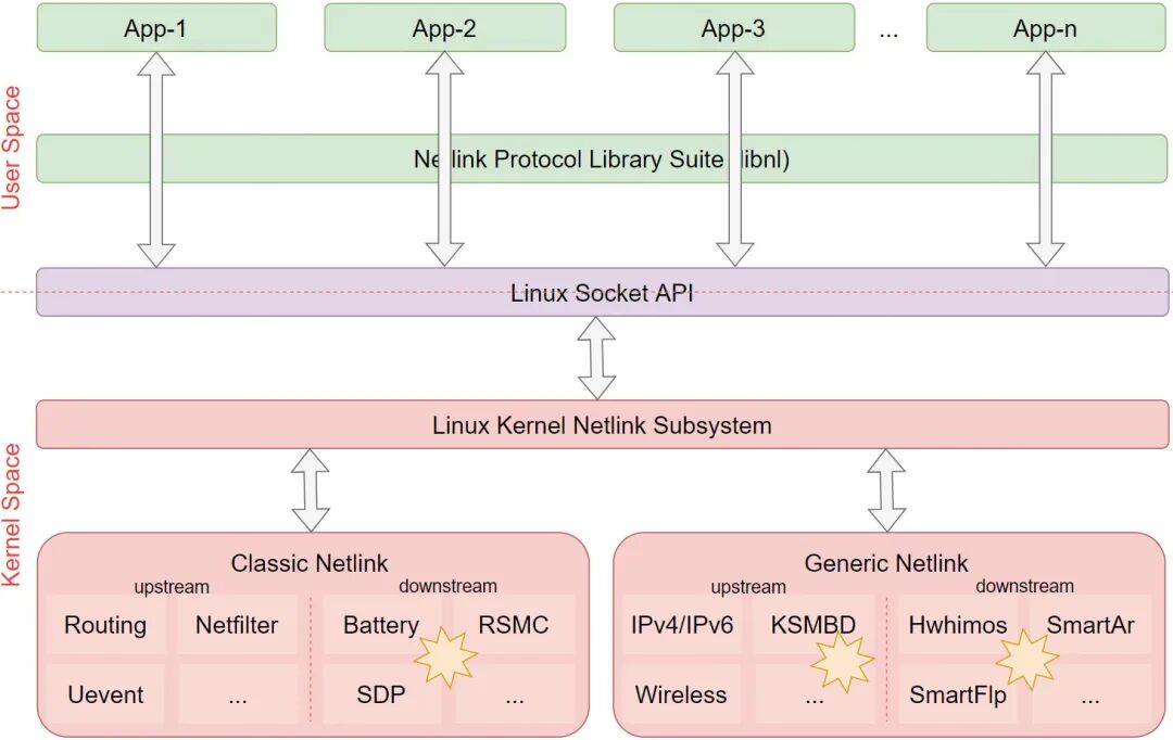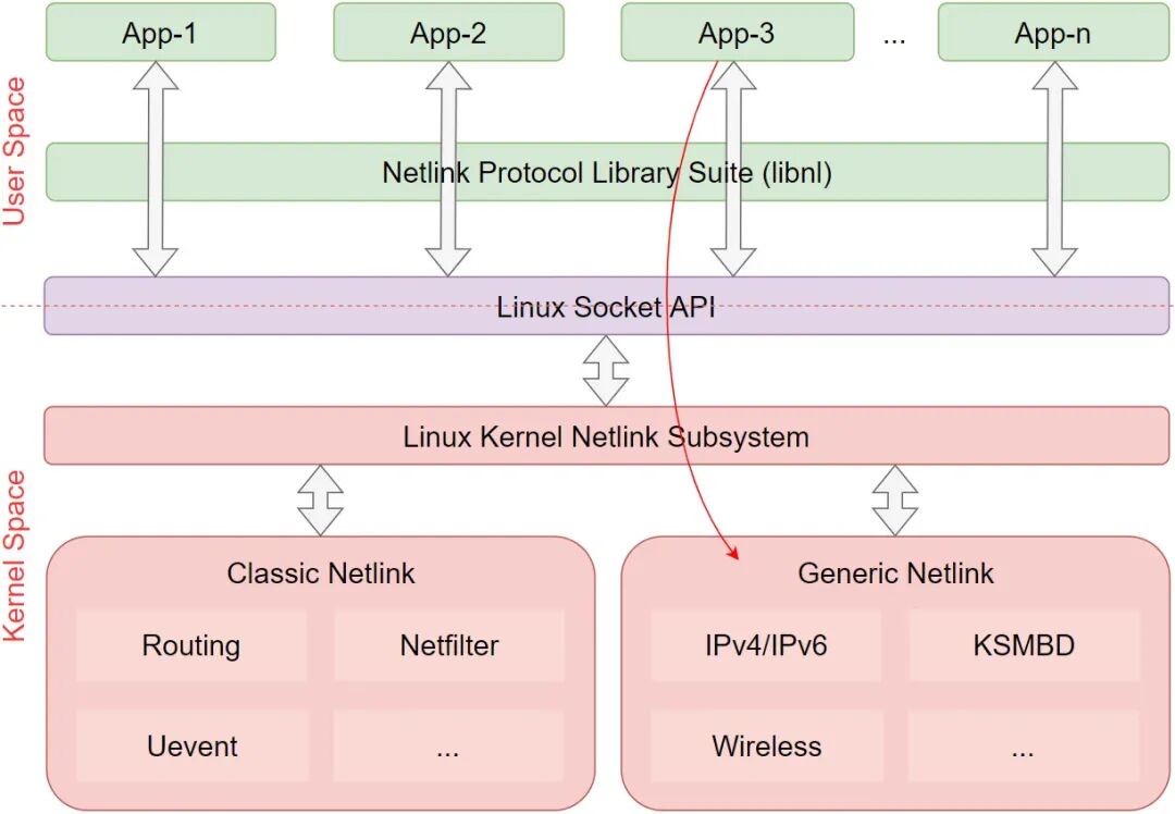 Generic Netlink编程模型 Generic Netlink套接字从2006年的Linux 2.6.15版本开始支持。所有自定义使用Generic Netlink的用户共享1个协议ID 16。当解析用户空间输入的消息时,只需要关注用户属性即可。 Top-Down方面,内核使用genl_register_family函数注册ops和small_ops,二者的区别在于small_ops提供了更少的消息处理函数,相同点在于都会指定doit函数。doit函数用于解析从用户空间输入的属性。 Bottom-Up方面,内核使用genlmsg_unicast、genlmsg_multicast、genlmsg_multicast_netns或者genlmsg_multicast_allns函数向用户空间主动发送组建好的Netlink属性。 Generic Netlink全双工编程模型 Netlink架构 Netlink架构方面,应用可以直接调用或者间接通过libnl调用Linux Socket API,将Netlink消息发送到内核空间。内核接收到Netlink消息后,会将其路由给Linux内核Netlink子系统,该子系统会根据Netlink类别分为Classic Netlink和Generic Netlink进行处理。下面我们将重点关注Netlink子系统对Netlink消息的处理机制。