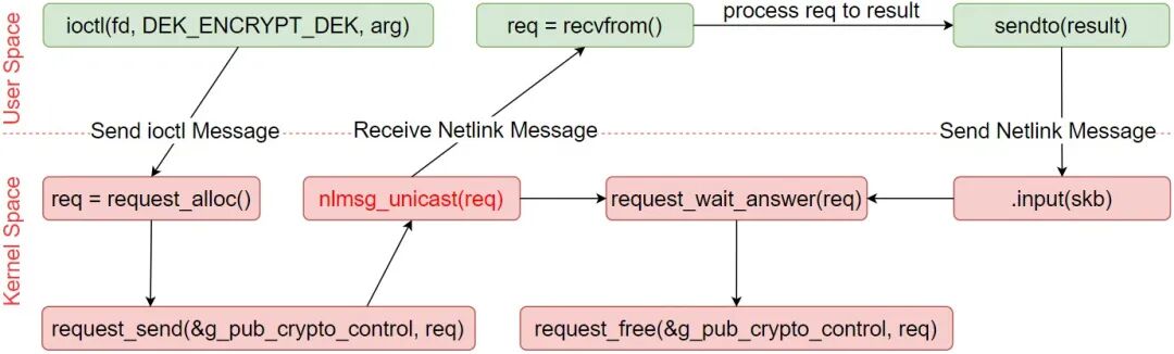 引出的思考是所有Netlink越解读漏洞都只是在接收缓冲区中吗?当然不是。这里有两个方法可以造成越解读到接收缓冲区外部: 通过setsockopt函数设置接收缓冲区大小为最小 精心构造Netlink消息,填充满接收缓冲区 案例2:攻击Classic Netlink消息组建过程 漏洞CVE-2024-20833 (NETLINK_FIPS_CRYPTO Use After Free)的场景则体现了Netlink全双工的优势,能够将部分不需要在内核执行的代码转移到用户空间去执行,以减少内核漏洞产生概率。该漏洞挖掘过程中,我们首先定位nlmsg_unicast函数,然后绘制出请求的整个生命周期,最终在input函数中发现UAF漏洞。该漏洞需要结合ioctl去触发,形成的根因是未保护的全局变量。