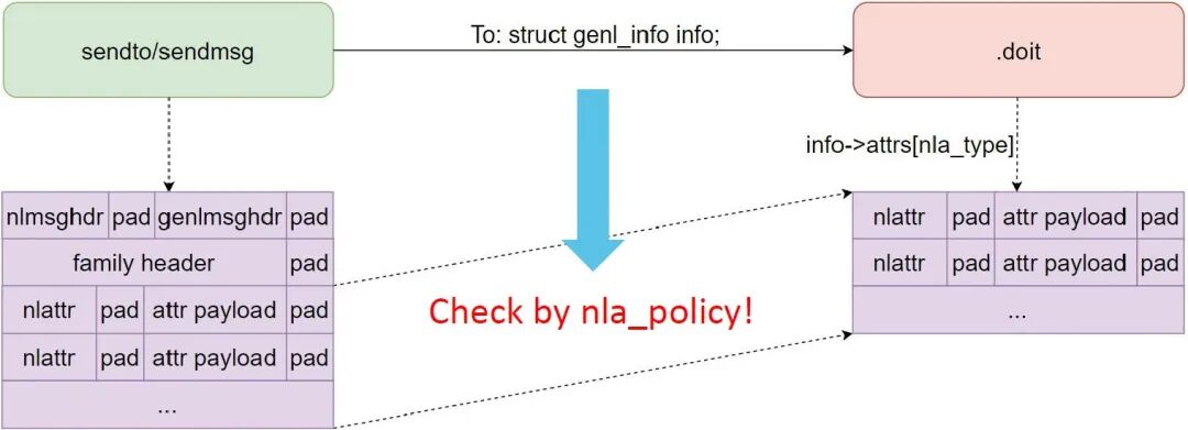 Generic Netlink传输消息格式 family头是可选的、用户自定义的,因此我们聚焦在Generic Netlink消息头和属性头。genlmsghdr结构体由命令、版本和保留三个字段组成,其中命令字段用于指导内核调用具体的doit函数。nlattr结构体由Netlink属性长度和类型两个字段组成,与属性负载一起形成了TLV结构。Netlink属性长度是属性的总长度,包含了属性头;Netlink属性类型一般是属性数组的索引。 Generic Netlink也是通过sendto或者senmsg函数将传输消息从用户空间发送到内核空间。info参数中包含了该传输属性,它是doit函数的一个参数,doit函数由genl_register_family注册,用于解析该传输属性。可以通过info->attrs[nla_type]获取该传输属性。相同的问题是Linux内核Netlink子系统会如何检查该传输属性?答案是通过nla_policy检查。