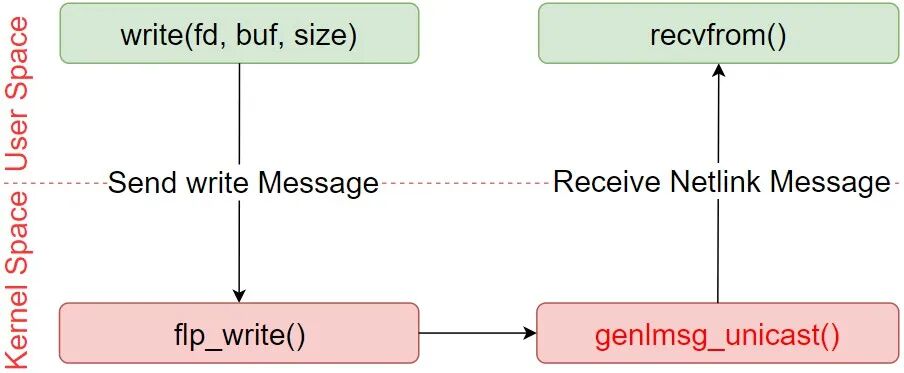 漏洞案例3数据流图 案例4:攻击Generic Netlink消息组建过程 漏洞CVE-2023-52103 (Driver flp OOB Read)的场景是单纯的Generic Netlink Bottom-Up场景。通过genlmsg_unicast可以逆推出整个消息的生命周期,进而漏洞挖掘出flp_write函数中存在越界读,读的数据是通过genlmsg_unicast发送到用户空间。该漏洞需要与write去触发,形成的根因是不严格的消息内容合法性检查。