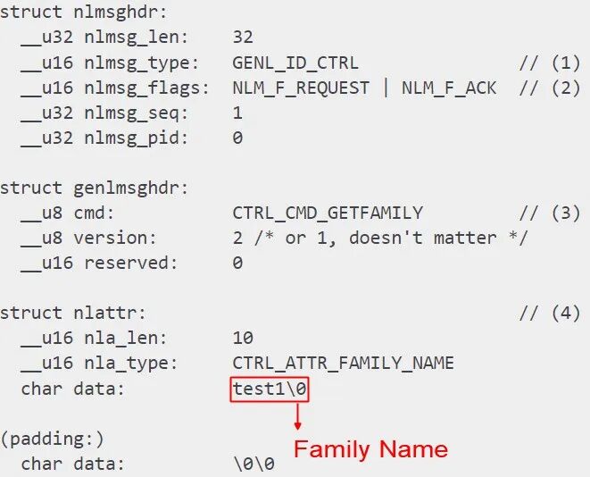 漏洞案例4数据流图 Classic Netlink验证 如果想要使用Netlink触发竞争条件,经常会遇到源端口占用问题。此时可以通过在多进程中使用进程ID作为源端口、或者在多线程中尝试可用的端口两种简单方式解决。 Generic Netlink验证 如果想要自定义使用Generic Netlink,在用户态首先要解决的问题就是将Family Name转化为Family ID,可以发送固定消息进行获取。